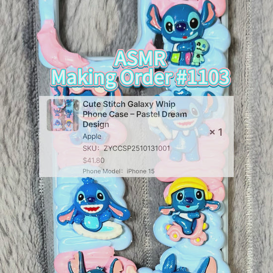 This handmade pastel phone case features adorable Stitch figures surrounded by dreamy pink and blue whipped cream swirls. Each pose captures Stitch’s playful charm — from skating to snacking! Perfect for fans who love kawaii, colorful, and one-of-a-kind accessories. 💫